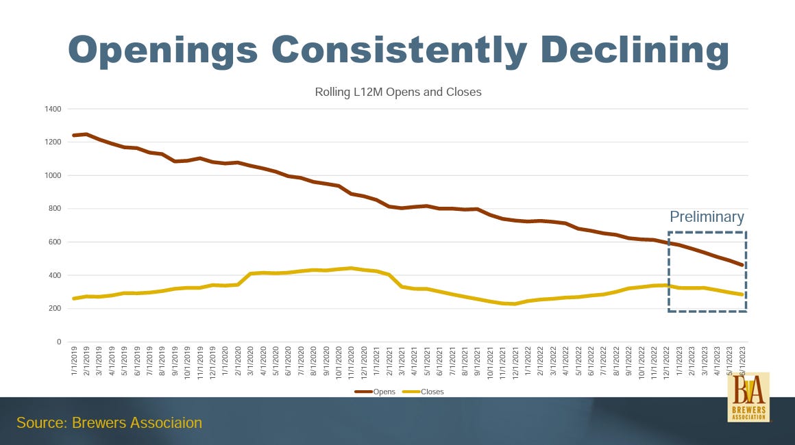 But in the Brewers Association’s mid-year briefing about the state of independent beer, that trend is looking like it may finally be nearing its end. It hasn’t reversed quite yet, but openings are slowing down and closings are slightly accelerating. The data for the first half of 2023 is preliminary, and even Brewers Association chief economist Bart Watson indicated that closings are more difficult to accurately report (breweries, naturally, are far more excited to report their opening than their closing), but the trend lines are getting close.