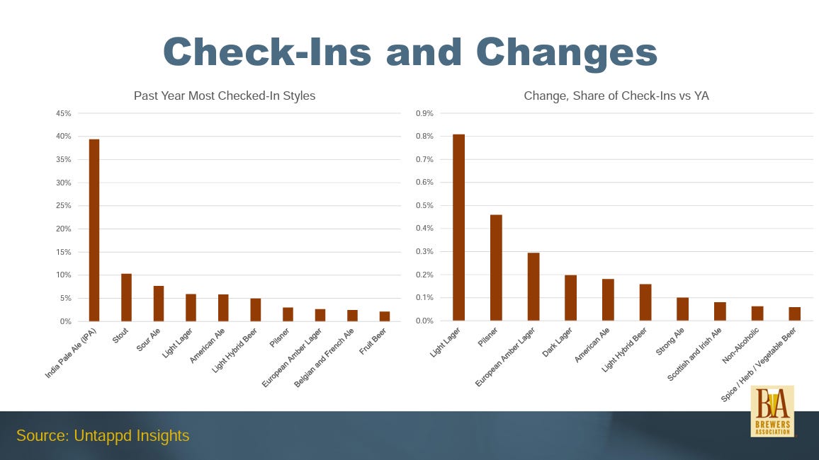 Another trend in beer from the Brewers Association’s report that made me happy: the increasing popularity of lagers. While any Untappd Insights data needs to be taken with a grain of salt (Untappd users obviously don’t represent the beer-drinking populace as a whole), the four fastest-growing beer styles for check-ins on the app over the past twelve months were all lagers: Light Lager, Pilsner, European Amber Lager, and Dark Lager. Yes, IPA is still very much king (nearly 40% of all check-ins on Untappd are IPAs), but after years of beer writers proclaiming every year to be “the Year of the Lager” in their New Year predictions, maybe — just maybe — it’s finally getting the respect it deserves among the nerdiest, most haze-crazed subset of beer drinkers.